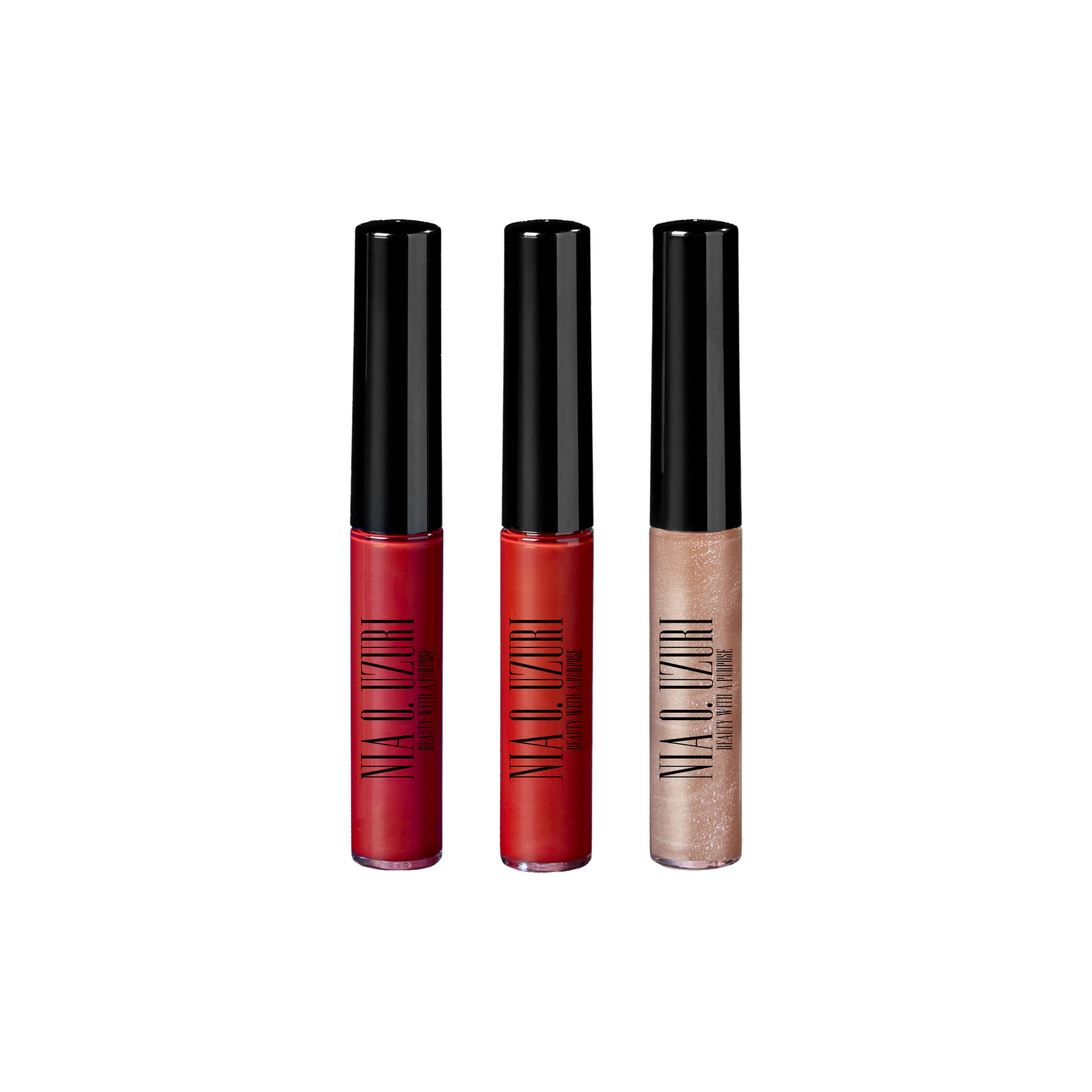 High-impact color in bold finishes. Each mini trip contains 1 lip vinyl, 1 liquid velvet, and 1 lip glaze curated by mood, from deep berries to whisper-soft nudes.